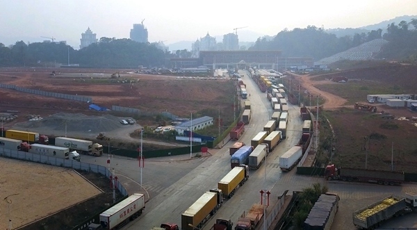 磨憨口岸新貨運通道前,貨運卡車排起長龍。