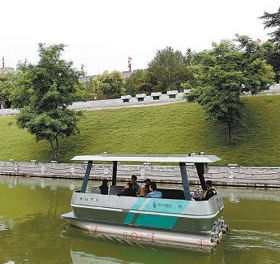 游客在西安護城河乘坐自動駕駛游船游覽。 本報記者 原韜雄攝
