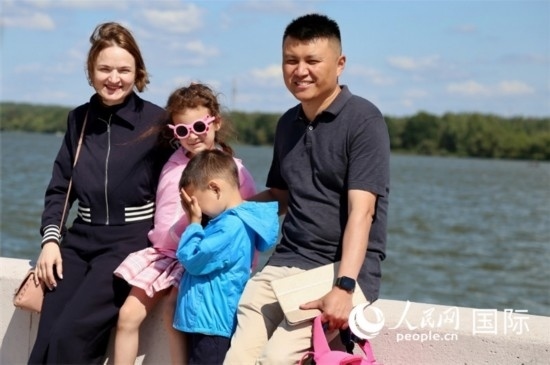 邢亮與妻子娜斯佳還有孩子們?cè)诤吷⒉健H嗣窬W(wǎng)記者 朱虹攝