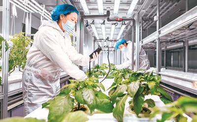 在呼和浩特市的內(nèi)蒙古宇生樂(lè)谷豐現(xiàn)代農(nóng)業(yè)產(chǎn)業(yè)園久和數(shù)智植物工廠,工人正進(jìn)行果蔬生產(chǎn)管理。