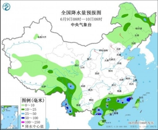 圖2 全國降水量預(yù)報圖(6月9日08時-10日08時)