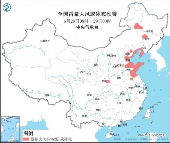 預(yù)計(jì),6月28日08時(shí)至29日08時(shí),遼東半島、北京東部、天津北部、河北東北部、山東中東部、四川東部、陜西南部、重慶大部、湖北西部等地部分地區(qū)有大到暴雨,其中,重慶北部局地有大暴雨(100~140毫米)。上述部分地區(qū)伴有短時(shí)強(qiáng)降水(最大小時(shí)降雨量30~50毫米,局地可超過60毫米),內(nèi)蒙古東北部、黑龍江西南部、吉林中西部、遼寧南部、陜西東南部、河北東部、北京東部、天津、山東北部和東部、安徽北部、江蘇北部等地的部分地區(qū)將有8~10級雷暴大風(fēng)或冰雹天氣,局地風(fēng)力可達(dá)11級(見圖1和圖2)。中央氣象臺(tái)6月28日06時(shí)繼續(xù)發(fā)布暴雨藍(lán)色預(yù)警和強(qiáng)對流天氣藍(lán)色預(yù)警。
