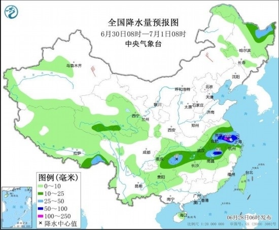 6月30日08時(shí)至7月1日08時(shí),黑龍江北部、西藏東南部、青海南部、江淮大部、江漢東部、江南北部、西南地區(qū)東部等地部分地區(qū)有中到大雨,其中,安徽中南部、江蘇南部、上海北部、江西北部等地部分地區(qū)有暴雨或大暴雨(100~150毫米)。內(nèi)蒙古中部部分地區(qū)有4~6級風(fēng),其中,新疆東部部分地區(qū)有6~7級風(fēng)(見圖5)。