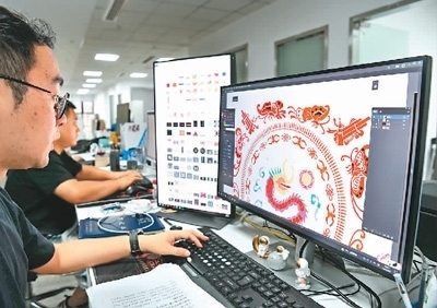 多彩貴州文化數(shù)據(jù)平臺有限公司的設計師在電腦上做苗繡矢量化提取。