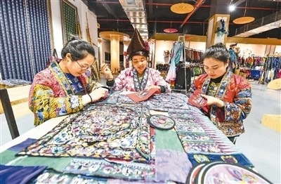 在苗族聚居的貴州,近年來將這一文化瑰寶作為產(chǎn)業(yè)大力推動發(fā)展,婦女們背著娃、繡著花、養(yǎng)活自己養(yǎng)活家,不僅用一針一線“繡”出美好生活,還將蘊藏著古老文化的苗繡巧妙融入時尚元素,形成產(chǎn)業(yè)融合互動。如今,古老的苗繡日益走進大眾生活,煥發(fā)蓬勃生機。