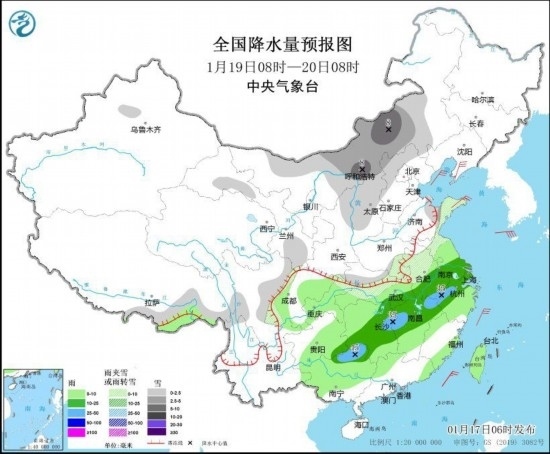 1月19日08時(shí)至20日08時(shí),內(nèi)蒙古中部和東南部、西藏南部、陜西北部、華北西部和北部、黃淮東部、江淮北部、湖北北部、川西高原等地部分地區(qū)有小到中雪或雨夾雪,其中,內(nèi)蒙古中部等地局地有大雪(5~8毫米)。江淮東部和南部、江漢東部、江南、西南地區(qū)東部、華南北部和西部、臺(tái)灣島等地部分地區(qū)有小到中雨,其中,安徽南部、湖南東北部、江西北部、廣西東北部等地局地有大雨(25~45毫米)。遼東半島、山東半島等地部分地區(qū)有4~6級風(fēng)(見圖3)。