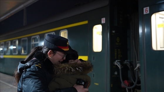 14號車廂內,來自黑龍江省齊齊哈爾市泰來縣的王興海和陳玉倩望著車窗外、站臺上的王靚怡,喜笑顏開??缭?700多公里、歷時52個小時,只為給女兒一個驚喜,陪她在崗過年。