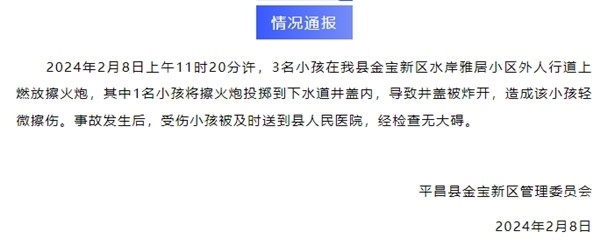 ·四川平昌通報(bào)“小孩放鞭炮炸飛多個(gè)井蓋”:1人輕微擦傷無大礙。