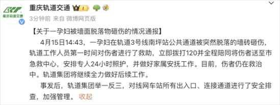 重慶地鐵站石磚脫落致孕婦被砸重傷,官方通報(bào)