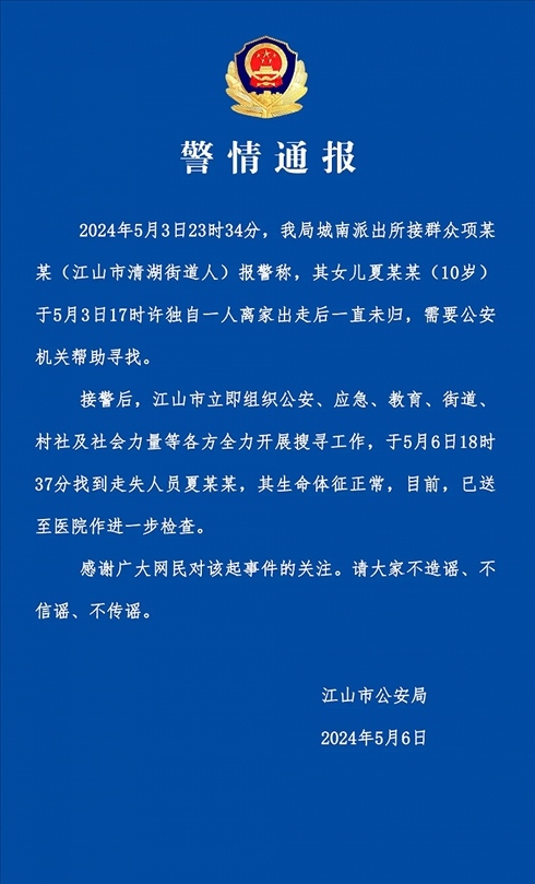 央視網(wǎng)消息:據(jù)江山公安微信公眾號(hào)消息,5月6日,浙江衢州江山市公安局通報(bào),5月3日23時(shí)34分,警方接群眾項(xiàng)某某(江山市清湖街道人)報(bào)警稱,其女兒夏某某(10歲)于5月3日17時(shí)許獨(dú)自一人離家出走后一直未歸,需要公安機(jī)關(guān)幫助尋找。接警后,江山市立即組織公安、應(yīng)急、教育、街道、村社及社會(huì)力量等各方全力開展搜尋工作,于5月6日18時(shí)37分找到走失人員夏某某,其生命體征正常,目前,已送至醫(yī)院作進(jìn)一步檢查。
