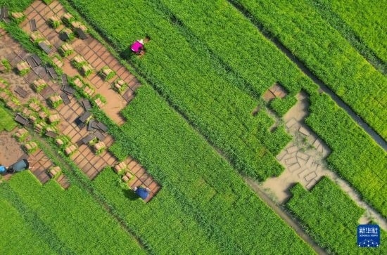 5月5日,在四川省內(nèi)江市東興區(qū)長(zhǎng)江現(xiàn)代農(nóng)業(yè)園區(qū),農(nóng)民在集中育秧基地起秧苗(無人機(jī)照片)。