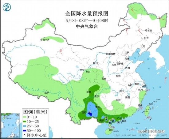 全國(guó)降水量預(yù)報(bào)圖(5月8日08時(shí)-9日08時(shí))