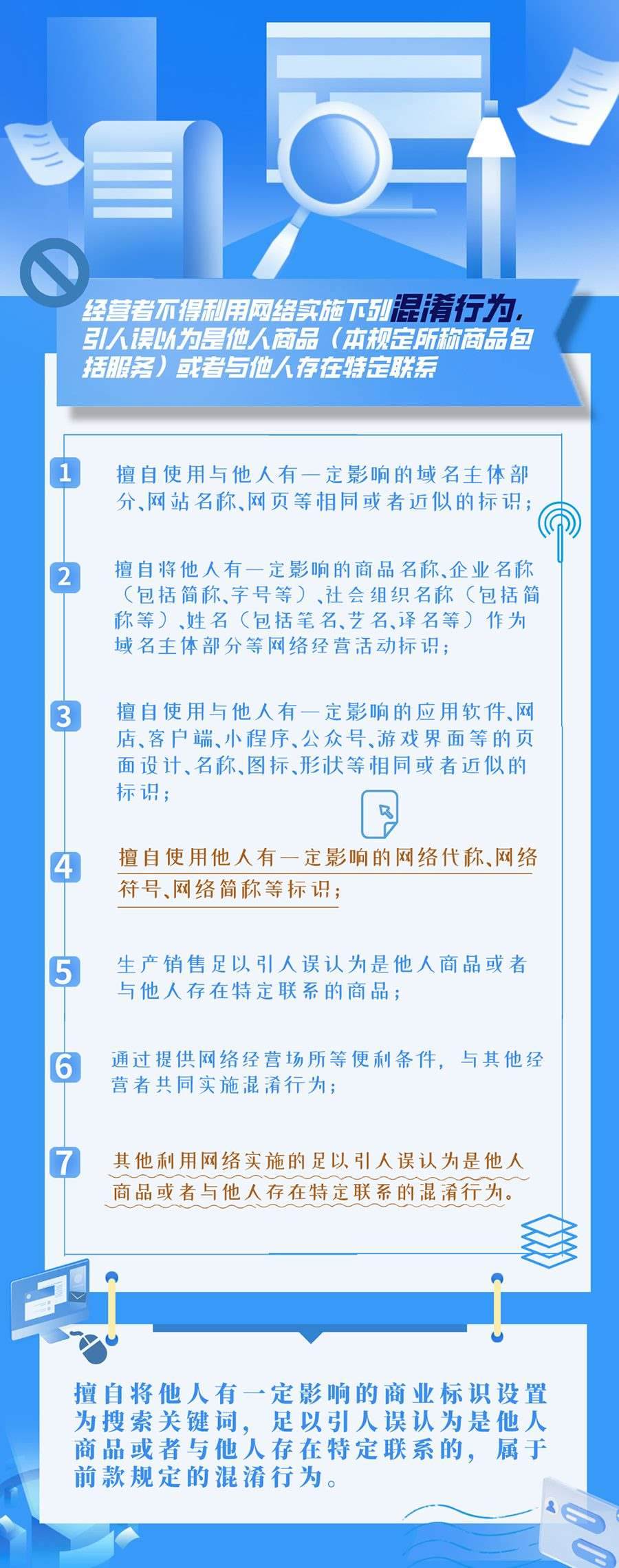 近日,市場(chǎng)監(jiān)管總局發(fā)布《網(wǎng)絡(luò)反不正當(dāng)競(jìng)爭(zhēng)暫行規(guī)定》,《規(guī)定》共五章、43條,其中在“網(wǎng)絡(luò)不正當(dāng)競(jìng)爭(zhēng)行為”部分按類(lèi)提煉梳理共計(jì)20條,明確認(rèn)定標(biāo)準(zhǔn)。