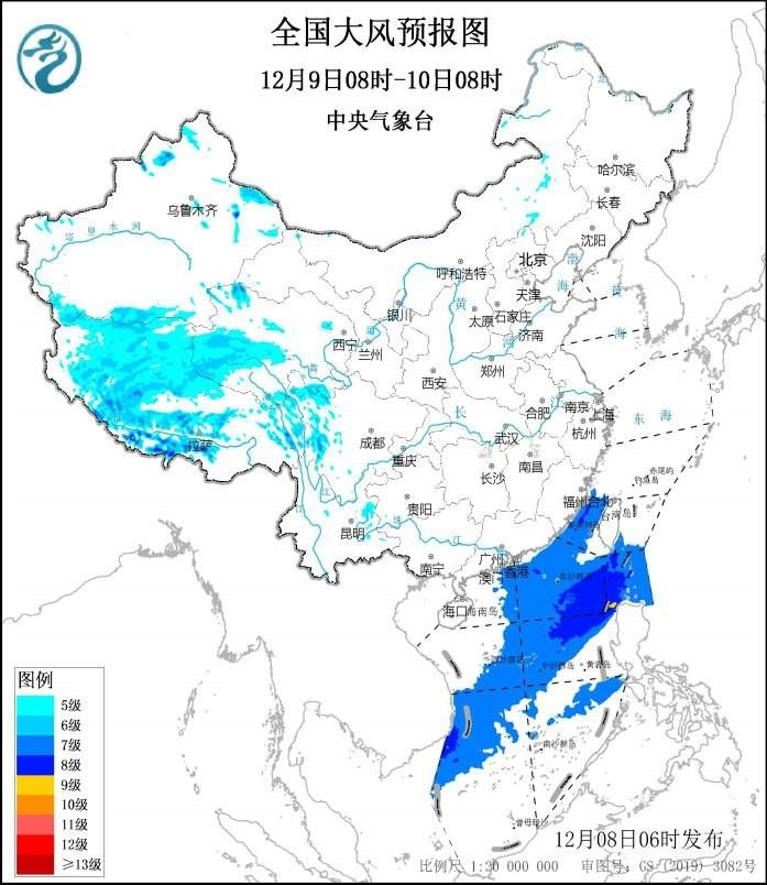 預計,12月8日08時至9日08時,西藏中西部、青海西南部、川西高原、新疆北部等地部分地區(qū)將有5~6級風,西藏中西部和青海西南部局地風力可達7~8級;東海大部、臺灣海峽、臺灣以東洋面、巴士海峽、南海北部、中部和西南部海域、北部灣將有7~8級、陣風9級的大風,其中臺灣海峽部分海域的風力可達9級、陣風10級。