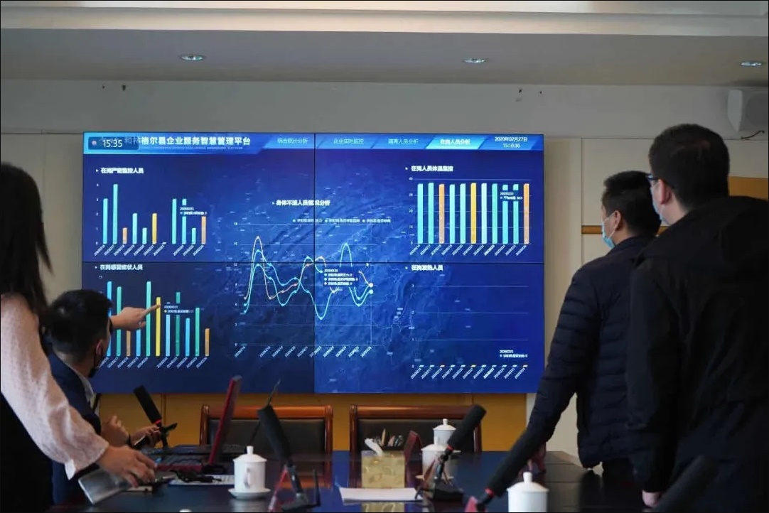 和林縣經(jīng)濟(jì)開發(fā)區(qū)三樓會議室,縣委書記張永文,縣委副書記、縣長陳利音正通過經(jīng)濟(jì)開發(fā)區(qū)企業(yè)服務(wù)智慧管理平臺,對開發(fā)區(qū)企業(yè)防控、生產(chǎn)進(jìn)行現(xiàn)場調(diào)度。