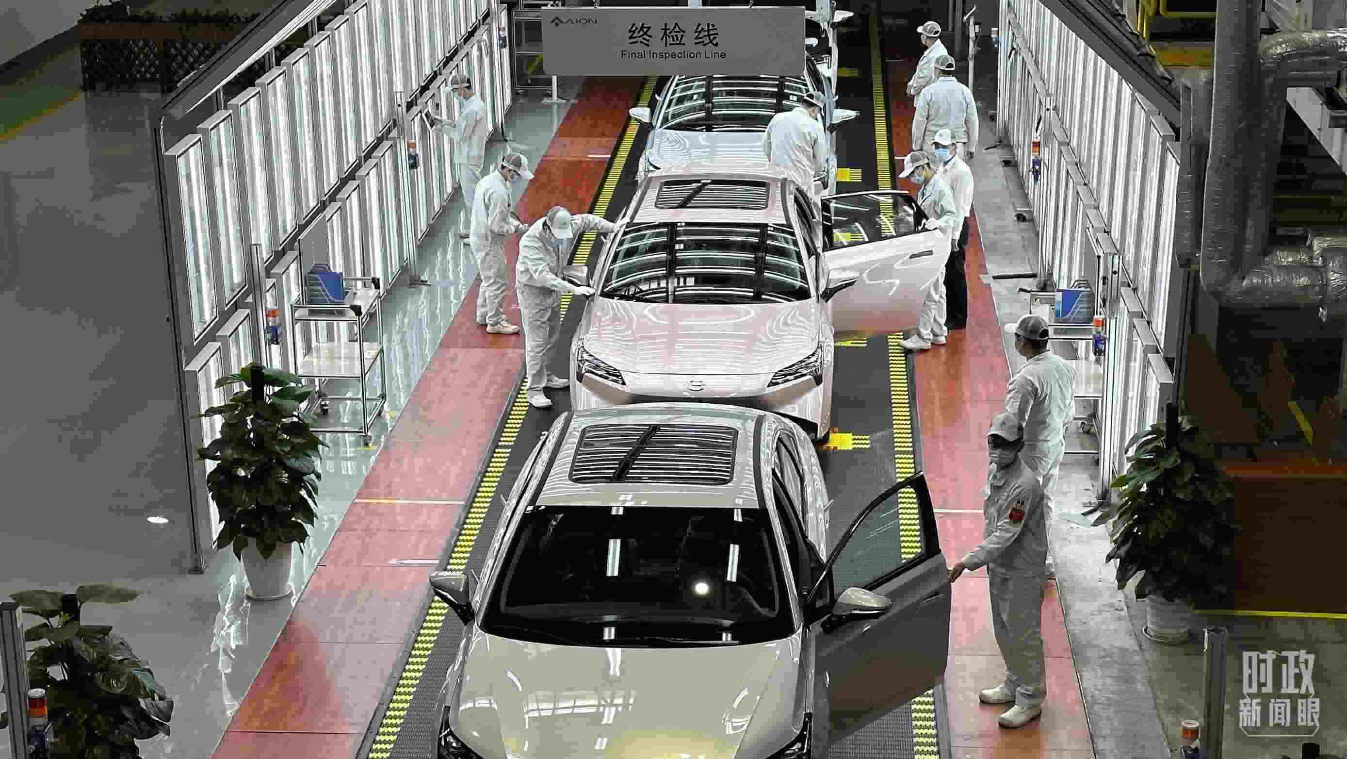 △廣汽埃安總裝車間終檢線作業(yè)現(xiàn)場(chǎng)。(總臺(tái)央視記者趙化拍攝)