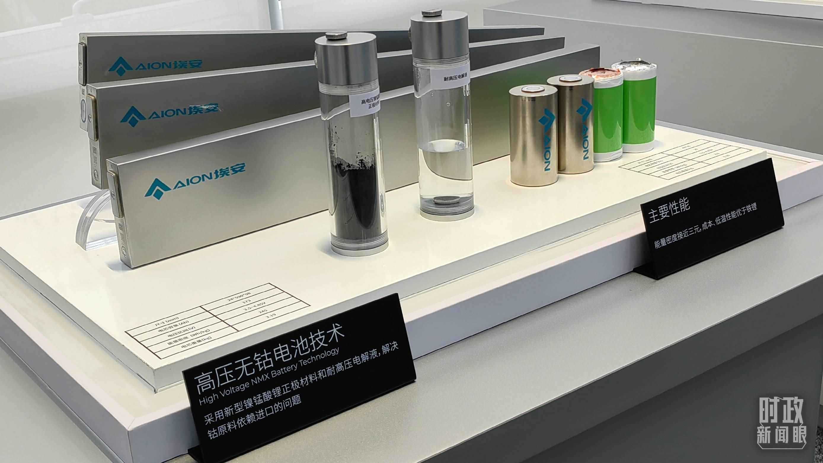 △廣汽埃安展示的高壓無(wú)鈷電池技術(shù),采用新型鎳錳酸鋰正極材料和耐高壓電解液,解決了鈷原料依賴進(jìn)口的問題。(總臺(tái)央視記者張曉鵬拍攝)