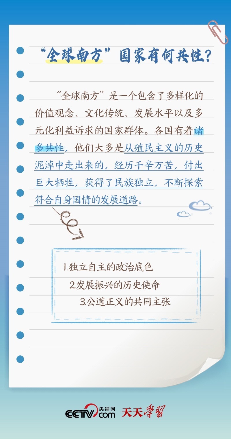 此次出訪,習(xí)近平主席在向約翰內(nèi)斯堡金磚國(guó)家工商論壇閉幕式發(fā)表致辭、同南非總統(tǒng)拉馬福薩共同會(huì)見(jiàn)記者等場(chǎng)合均提及“全球南方”。什么是“全球南方”?“全球南方”國(guó)家有何共性?中國(guó)為何是“全球南方”的天然成員?跟著央視網(wǎng)《天天學(xué)習(xí)》一起了解。