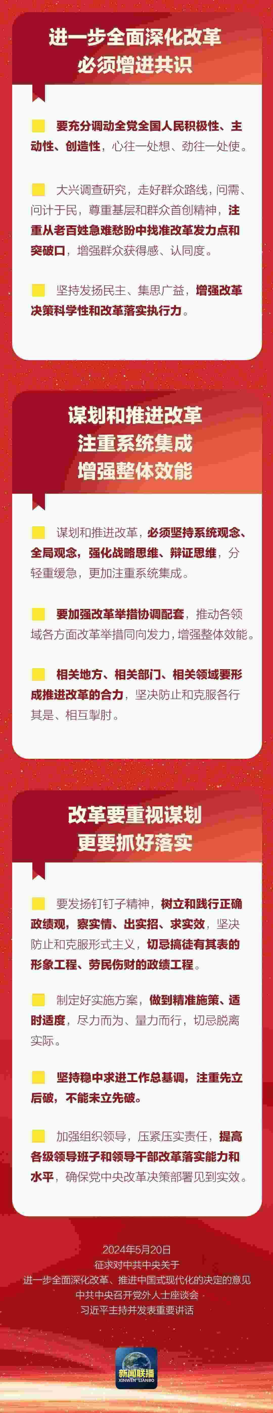 中共中央5月20日在中南海召開黨外人士座談會,就中共中央關于進一步全面深化改革、推進中國式現(xiàn)代化的決定聽取各民主黨派中央、全國工商聯(lián)負責人和無黨派人士代表的意見建議。中共中央總書記習近平主持座談會并發(fā)表重要講話。
