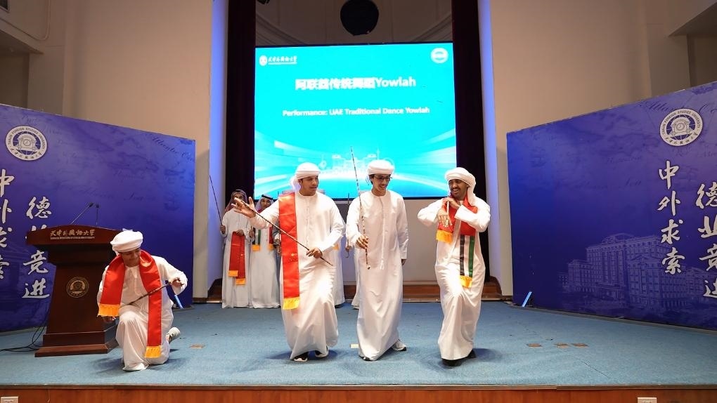 天津外國語大學(xué)的校園里,海棠盛開,綠意盎然。在此次交流學(xué)習(xí)項(xiàng)目的開班儀式上,中阿兩國學(xué)生代表以精彩演出互致青春?jiǎn)柡颍褐袊褡鍢菲鼾R奏《云之南》、中阿雙語演唱《我們都一樣》、節(jié)奏明快的阿聯(lián)酋傳統(tǒng)舞蹈點(diǎn)燃活動(dòng)現(xiàn)場(chǎng)……
