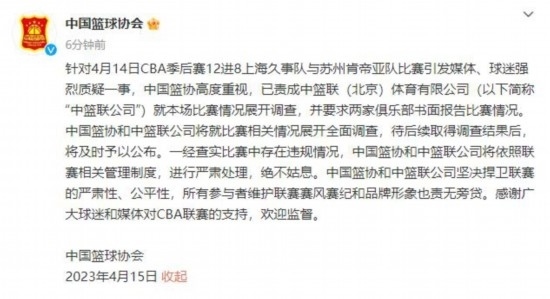 CBA聯(lián)賽官方微博15日凌晨發(fā)布消息表示:針對4月14日2022-2023賽季CBA聯(lián)賽季后賽12進8、上海久事隊與蘇州肯帝亞隊比賽引發(fā)媒體、球迷強烈質(zhì)疑一事,中籃聯(lián)(北京)體育有限公司(以下簡稱“中籃聯(lián)公司”)高度重視,已就本場比賽情況展開調(diào)查,中國籃協(xié)也在第一時間責成中籃聯(lián)公司查明情況。中籃聯(lián)公司待后續(xù)取得調(diào)查結(jié)果后,將及時予以發(fā)布。