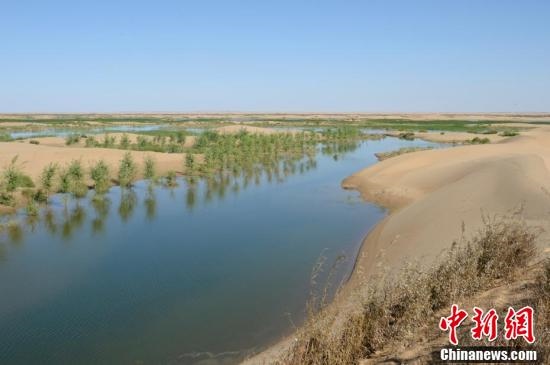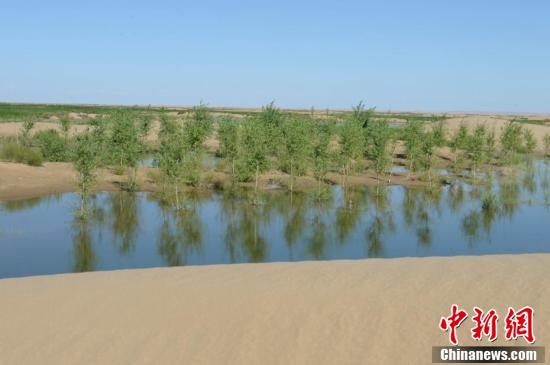 7月24日,引自黃河的凌水讓沙漠上充滿生機。據(jù)悉,中國第七大沙漠--庫布齊沙漠所處的杭錦旗境內(nèi),每年過境水量310億立方米,當?shù)匾荒耆忠坏臅r間都是凌汛期。政府因地制宜,2016年投資建成分凌引水渠、生態(tài)圍堤等設(shè)施,自2016年至2018年黃河凌汛期以來,累計分凌5千余萬立方米,形成約36平方公里保護濕地的面積,原來為沙漠的地貌逐漸變成綠洲,農(nóng)牧民開始發(fā)展野牛養(yǎng)殖與農(nóng)家樂旅游業(yè)。中新社記者劉文華攝