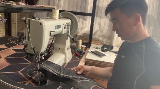 圖為阿巴嘎旗綜合實訓基地內,一名小伙子正在制作搏克手的摔跤服。
