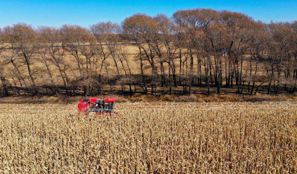 10月18日,這是通遼市奈曼旗新鎮(zhèn)正在收獲的玉米地。(無(wú)人機(jī)照片 新華社記者 連振 攝)