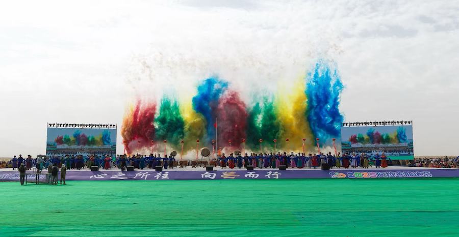 2025阿拉善那達(dá)慕開幕式現(xiàn)場(chǎng),舞臺(tái)上五彩煙霧升騰