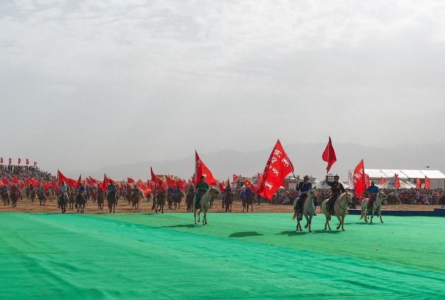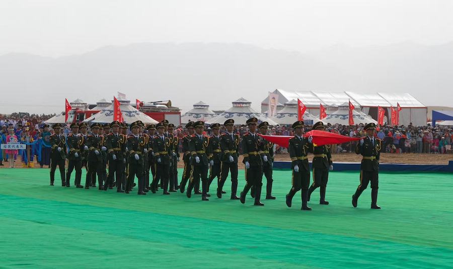 2025阿拉善那達(dá)慕開幕式上儀仗隊(duì)護(hù)送國(guó)旗走向場(chǎng)地
