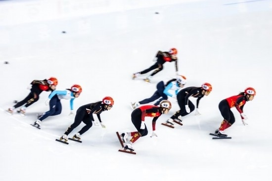 2月17日,第十四屆全國(guó)冬季運(yùn)動(dòng)會(huì)短道速滑(公開(kāi)組)女子3000米接力半決賽中。新華社記者 黃偉 攝