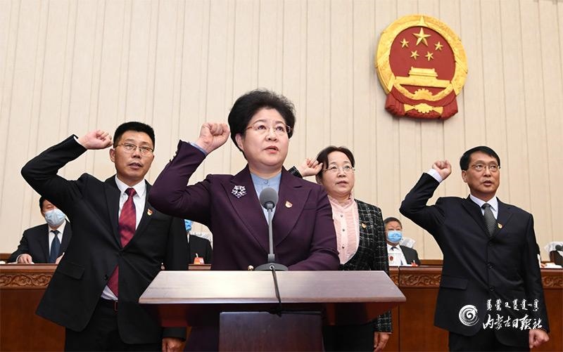 1月20日上午,自治區(qū)十三屆人大常委會第二十四次會議舉行了憲法宣誓儀式。自治區(qū)黨委書記、人大常委會主任石泰峰主持并監(jiān)誓。圖為新任職人員在依法進(jìn)行憲法宣誓。內(nèi)蒙古日報記者 袁永紅 攝