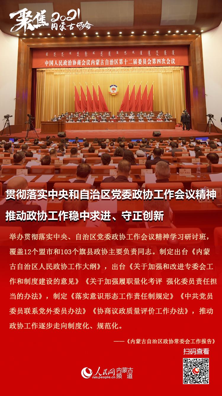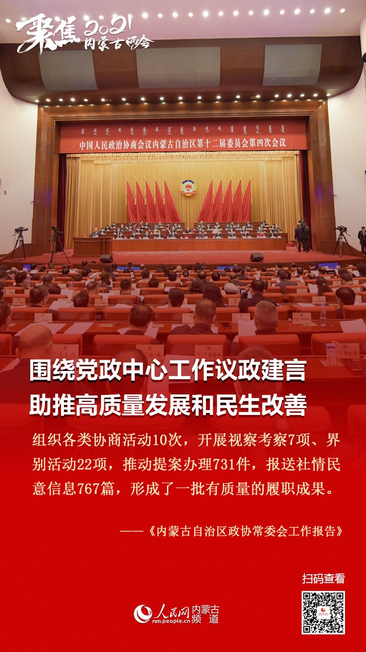 1月25日上午,自治區(qū)政協(xié)十二屆四次會(huì)議在內(nèi)蒙古人民會(huì)堂隆重開幕。自治區(qū)政協(xié)主席李秀領(lǐng)作政協(xié)內(nèi)蒙古自治區(qū)第十二屆委員會(huì)常務(wù)委員會(huì)工作報(bào)告。今年的政協(xié)常委會(huì)工作報(bào)告都有哪些亮點(diǎn),2021年主要工作安排有哪些,七張圖帶您梳理!